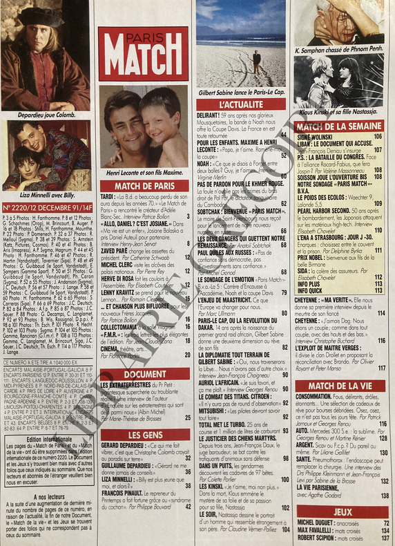 140 PAGES-JACQUES TARDI; ENTRETIEN, 3P-FRANCO MARIA RICCI; "F.M.R" LES TROIS LETTRES LES PLUS ELEGANTES DE L'EDITION, 1P-LES EXTRA TERRESTRES DU PROFESSEUR PETIT; ENTRETIEN, 6P-GERARD DEPARDIEU EN CHRISTOPHE COLOMB LES PREMIERES PHOTOS, 4P-LIZA MINNELLI, 4P-FRANCOIS PINAULT DOIT SES SUCCES AU "SYNDROME DU COCHON", 2P-LA FRANCE GAGNE LA COUPE DAVIS, 8P-LES JOUEURS ET LEURS ENFANTS; HENRI LECONTE ET SON FILS, 4P-PAS DE PARDON POUR LE KHMER ROUGE; KHIEU SAMPHAN, 4P-ANATOLI SOBTCHAL RECOIT PARIS MATCH, 5P-PARIS LE CAP OU LA REVOLUTION DU DAKAR, AVEC LA CARTE OFFICIELLE DU RALLYE, 8P-JEAN FRANCOIS DAUX; JUSTICIER DES CHIENS MARTYRS, 4P-LES KINSKI, 4P-CHEYENNE BRANDO "MA VERITE", 5P