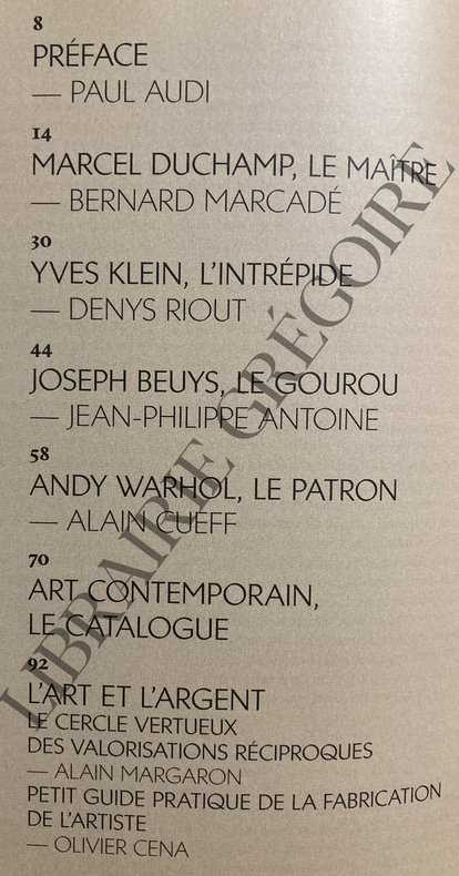 MARCEL DUCHAMP, LE MAITRE, PAR BERNARD MARCADE-YVES KLEIN, L'INTREPIDE, PAR DENYS RIOUT-JOSEPH BEUYS, LE GOUROU, PAR JEAN-PHILIPPE ANTOINE-ANDY WARHOL, LE PATRON, PAR ALAIN CUEFF-L'ART ET L'ARGENT LE CERCLE VERTUEUX DES VALORISATIONS RECIPROQUES, PAR ALAIN MARGARON, PETIT GUIDE PRATIQUE DE LA FABRICATION DE L'ARTISTE, PAR OLIVIER CENA-(EM22)