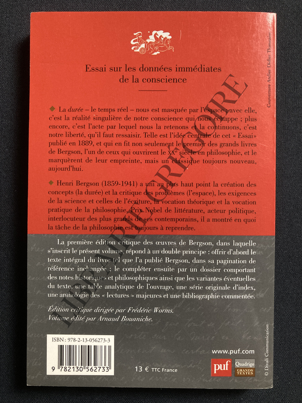 "Je me proposai, pour ma thèse de doctorat, d'étudier les concepts fondamentaux de la mécanique. C'est ainsi que je fus conduit à m'occuper de l'idée de temps. Je m'aperçus, non sans surprise, qu'il n'est jamais question de durée proprement dite en mécanique, ni même en physique, et que le "temps" dont on y parle est tout autre chose. Je me demandai alors où est la durée réelle, et ce qu'elle pouvait bien être, et pourquoi notre mathématique n'a pas de prise sur elle. De ces réflexions est sorti l'Essai sur les données immédiates de la conscience où j'essaie de pratiquer une introspection absolument directe et de saisir la durée pure." (Bergson, lettre à G. Papini, 21 octobre 1903). À la croisée de la psychologie et de la métaphysique, le premier ouvrage de Bergson, paru en 1889, contient en germe l'ensemble de sa philosophie. En nous invitant à nous déprendre de nos cadres de pensée figés, il y montre que le temps n'est pas une réalité physique, mais une dimension de la conscience vivante, et, tissant un lien entre philosophie de la conscience et théorie de l'action, il aborde à nouveaux frais la question de la liberté. L'influence de Bergson fut sensible chez certains socialistes, et des mouvements religieux libéraux qualifiés de modernistes ou néo-catholiques tentèrent de s’approprier ses thèses. L’Église catholique romaine réagit en mettant les trois ouvrages principaux de Bergson, dont celui-ci, à l’Index (décret du 1er juin 1914).