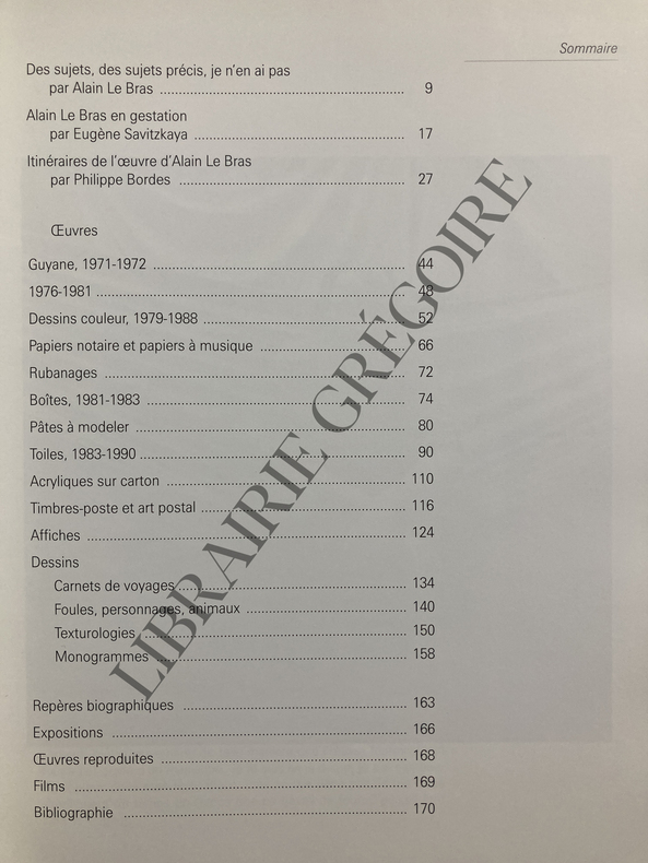 174 PAGES-25 CM X 31 CM-DES SUJETS, DES SUJETS PRECIS JE N'EN AI PAS, PAR ALAIN LE BRAS-ALAIN LE BRAS EN GESTATION, PAR EUGENE SAVITZKAYA-ITINERAIRES DE L'OEUVRE D'ALAIN LE BRAS PAR PHILIPPE BORDES-OEUVRES: GUYANE 1971-1972-1981, DESSINS COULEUR 1979-1988, PAPIERS NOTAIRE ET PAPIERS A MUSIQUE RUBANAGES, BOITES 1981-1983, PATES A MODELER, TOILES 1983-1990, ACRYLIQUES SUR CARTON, TIMBRES-POSTE ET ART POSTAL, AFFICHES, DESSINS: CARNETS DE VOYAGES, FOULES PERSONNAGES ANIMAUX, TEXTUROLOGIES, MONOGRAMMES-REPERES BIOGRAPHIQUES-EXPOSITIONS-OEUVRES REPRODUITES-FILMS-BIBLIOGRAPHIE-JAQUETTE-(100C)