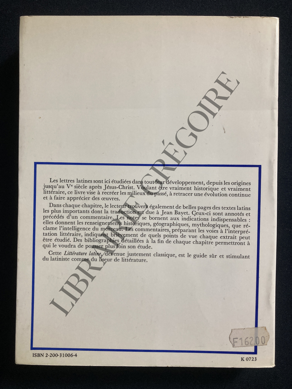 Augmentée d'une table de littérature latine , index alphabétique. Classification Dewey : 870-Littératures des langues italiques. Littérature latine