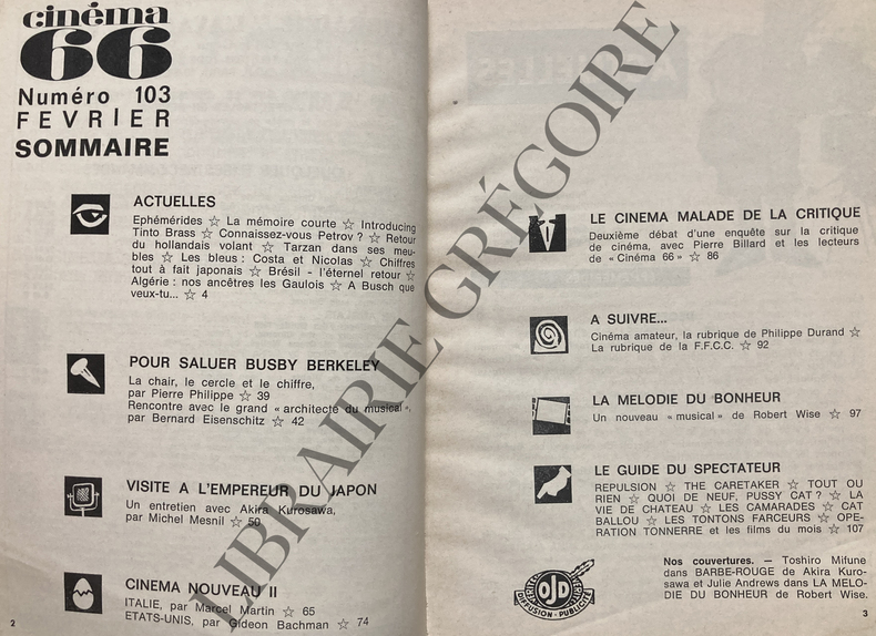 18 CM X 13 CM-130 PAGES-ENTRETIEN AVEC TINTO BRASS, 6P-ENTRETIEN AVEC COSTA GAVRAS ET NICOLAS GESSNER, 3P-ENTRETIEN AVEC AHMED RACHEDI ET MUSTAPHA BADIE, 5P-POUR SALUER BUSBY BERKELEY, 13P-ENTRETIEN AVEC AKIRA KUROSAWA, 15P-CINEMA NOUVEAU II ITALIE ET ETATS UNIS D'AMERIQUE-LA MELODIE DU BONHEUR, 8P-LE GUIDE DU SPECTATEUR; REPULSION, THE CARETAKER, TOUT OU RIEN, QUOI DE NEUF PUSSY CAT ?, LA VIE DE CHATEAU, LES CAMARADES, CAT BALLOU, LES TONTONS FARCEURS, OPERATION TONNERRE, LES ESPIONS MEURENT A BEYROUTH, COMPARTIMENT TUEURS, FANTOMAS SE DECHAINE (9E)