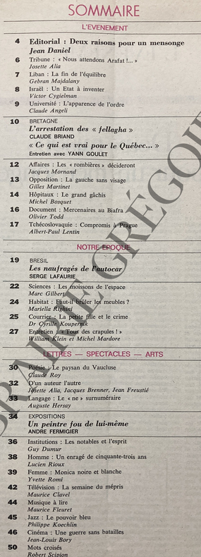 52 PAGES-LA FRANCE CONTRE ISRAEL ? DEUX RAISONS POUR UN MENSONGE, 2P-LIBAN; LA FIN DE L'EQUILIBRE, 1P-ISRAEL; UN ETAT A INVENTER, 1P-BRETAGNE; L'ARRESTATION DES "FELLAGHA", 1P-ENTRETIEN AVEC YANN GOULET, 1P-MERCENAIRES AU BIAFRA; ENTRETIEN DE MICHEL LE SIMPLE ET ROBERT LE SAGE, 2P-ENTRETIEN DE WILLIAM KLEIN, 2P-RENE CHAR, LE PAYSAN DU VAUCLUSE, 2P-CRITIQUE DU FILM "LE VENT DES AURES" DE MOHAMMED LAKHDAR HAMINA, 1P-LEGERE PLIURE VERTICALE EN MILIEU DE UNE