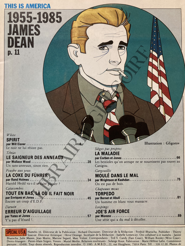 FORMAT 20,5 CM X 27,5 CM-100 PAGES-LE SPIRIT, PAR WILL EISNER, 7P-JAMES DEAN 1955/1985, 17P-LE SAIGNEUR DES ANNEAUX, PAR WALLACE WOOD, 6P-LA COKE DU FUHRER, PAR RAND HOLMES, 10P-TOUT EN BAS LA OU IL FAIT NOIR. 11P-ERREUR D'AIGUILLAGE, PAR TOM YEATES ET BRUCE JONES, 8P-LA MALADIE, PAR RICHARD CORBEN ET BRUCE JONES, 8P-MOULE DANS LE MAL, PAR BERNI WRIGHTSON ET GEORGES KASHDAN, 14P-JOE'S AIR FORCE, PAR PEPE MORENO, 10P (PRBD)