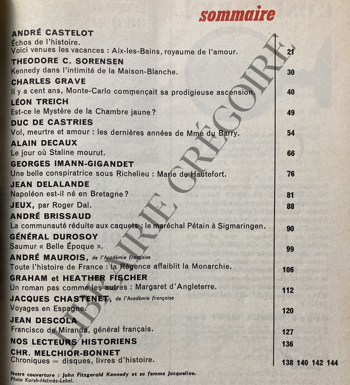 FORMAT 15,5 CM X 23,5 CM-146 PAGES-AIX LES BAINS, ROYAUME DE L'AMOUR, PAR ANDRE CASTELOT, 9P-KENNEDY DANS L'INTIMITE DE LA MAISON BLANCHE, 10P-IL Y A CENT ANTS MONTE CARLO COMMENCAIT SA PRODIGIEUSE ASCENSION, 9P-REICHENHALL: ASSASSINAT DE ADALBERT VON HARDEGG EN FEVRIER 1911; EST CE LE MYSTERE DE LA CHAMBRE JAUNE ? PAR LEON TREICH, 5P-LES DERNIERES ANNEES DE MADAME DU BARRY, 10P-LE JOUR OU STALINE MOURUT, PAR ALAIN DECAUX, 10P-MARIE DE HAUTEFORT, UNE BELLE CONSPIRATRICE SOUS RICHELIEU, 5P-NAPOLEON EST IL NE EN BRETAGNE ? PAR JEAN DELALANDE, 7P-LE MARECHAL PETAIN A SIGMARINGEN, PAR ANDRE BRISSAUD, 9P-LE CARROUSEL DE SAUMUR, PAR LE GENERAL MAURICE DUROSOY, 7P-LA REGENCE AFFAIBLIT LA MONARCHIE, PAR ANDRE MAUROIS, 6P-MARGARET D'ANGLETERRE, 8P-VOYAGES EN ESPAGNE, PAR JACQUES CHASTENET, 7P-FRANCISCO DE MIRANDA, GENERAL FRANCAIS, PAR JEAN DESCOLA, 8P-