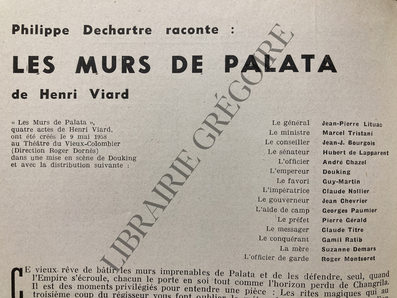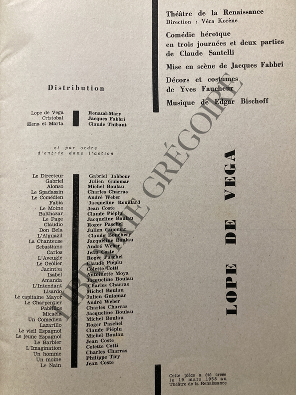 FORMAT 18 CM X 26,5 CM-56 PAGES-"LOPE DE VEGA" DE CLAUDE SANTELLI MISE EN SCENE PAR JACQUES FABBRI AU THEATRE DE LA RENAISSANCE, 37P-"CHARMANTE ENFANT" DE PIERRE SABATIER, 6P-"NE FAISONS PAS UN REVE" D'YVAN NOE, 4P-LA QUINZAINE DRAMATIQUE PAR ANDRE CAMP, 1P-PHILIPPE DECHARTRE RACONTE "LES MURS DE PALATA", 4P-