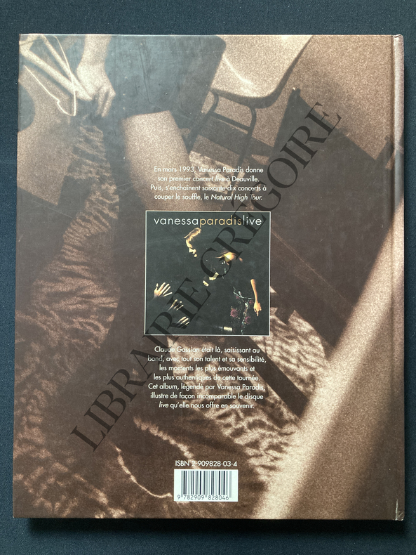 Editions Vade Retro / Polygram 1994. In-4 cartonnage éditeur non pagine ( d'environ 90 pages ) au format 31 x 24,7 cm. Couverture illustrée par une photographie. Dos carré avec titre. Plats et intérieur frais. Pages de garde avec photo. Petit encart avec texte de présentation de la chanteuse. Magnifique livre, composé de superbes photographies en couleurs et en noir, légendées par Vanessa Paradis et prises par Claude Gassian, pendant la tournée " Natural High Tour " de 1993, avec des extraits de textes de quelques chansons. Etat superbe de fraicheur. Edition originale. Précieux exemplaire enrichi d'une dédicace autographe, signée, de Vanessa Paradis : " Pour Jean-Marc ". Collection personnelle.