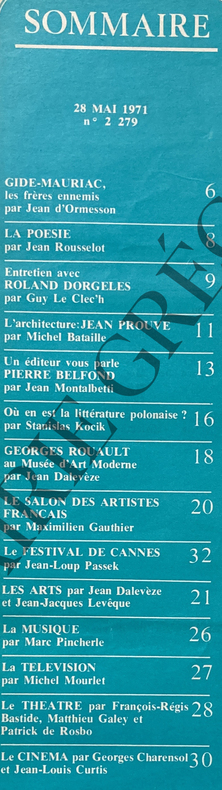 32 PAGES-25,5 CM X 37 CM-OEUVRE DE ROUAULT EN COUVERTURE-JACQUES MEDECIN ET LE FESTIVAL DU LIVRE, PAR PIERRE DE BOISDEFFRE, 1P, PHOTO-FRANCOIS NOURISSIER A LU: LE PASSE COMPOSE, DE FRANCOIS-MARIE BANIER, 1P, PHOTO-POESIE: A LA PORTEE DE TOUTES LES SOURCES, RENE CHAR, CAHIER DE L'HERNE, PHOTO R CHAR-ENTRETIEN AVEC.ROLAND DORGELES, 1P, PHOTO-JEAN PROUVE: REVIVRE LA TRADITION, 1P 2 PHOTOS-OU EN EST LA LITTERATURE POLONAISE?, PAR STANISLAS KOCIK, 2P, 3 PHOTOS-ROUAULT AU MUSEE NATIONAL D'ART MODERNE VISIONNAIRE, SOLITAIRE ET FRATERNEL, 2P, PROPOS RECUEILLIS PAR JEAN DALEVEZE, 4 PHOTOS-CINEMA, PAR GEORGES CHARENSOL: LES AVEUX LES PLUS DOUX, D'EDOUARD MOLINARO, PHOTO (POREL, NOIRET, HANIN)-