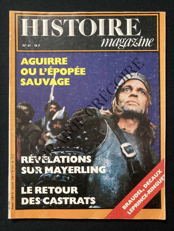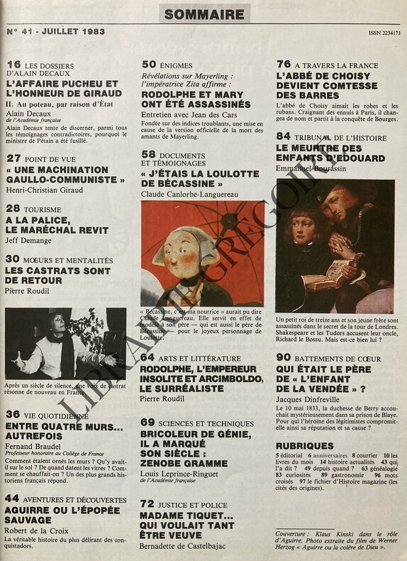 FORMAT 20,5 CM X 27,5 CM-100 PAGES-L'AFFAIRE PIERRE PUCHEU ET L'HONNEUR DE GIRAUD, II. AU POTEAU PAR RAISON D'ETAT, 12P-LES CASTRATS SONT DE RETOUR, 5P-ENTRE QUATRE MURS AUTREFOIS, 7P-AGUIRRE OU L'EPOPEE SAUVAGE, 5P-REVELATIONS SUR MAYERLING: RODOLPHE ET MARY ONT ETE ASSASSINES; ENTRETIEN AVEC JEAN DES CARS, 8P-CLAUDE CANLORBE LANGUEREAU; "J'ETAIS LA LOULOTTE DE BECASSINE", 5P-RODOLPHE II L'EMPEREUR INSOLITE ET ARCIMBOLDO LE SURREALISTE, 4P-ZENOBE GRAMME RACONTE PAR LOUIS LEPRINCE RINGUET, 4P-MADAME TIQUET QUI VOULAIT TANT ETRE VEUVE, 4P-FRANCOIS TIMOLEON DE CHOISY DEVIENT COMTESSE DES BARRES, 8P-TRIBUNAL DE L'HISTOIRE: IL Y A 500 ANS LE MEURTRE DES ENFANTS D'EDOUARD, 5P-QUI ETAIT LE PERE D'ANNE ROSALIE "L'ENFANT DE LA VENDEE" ? 6P-