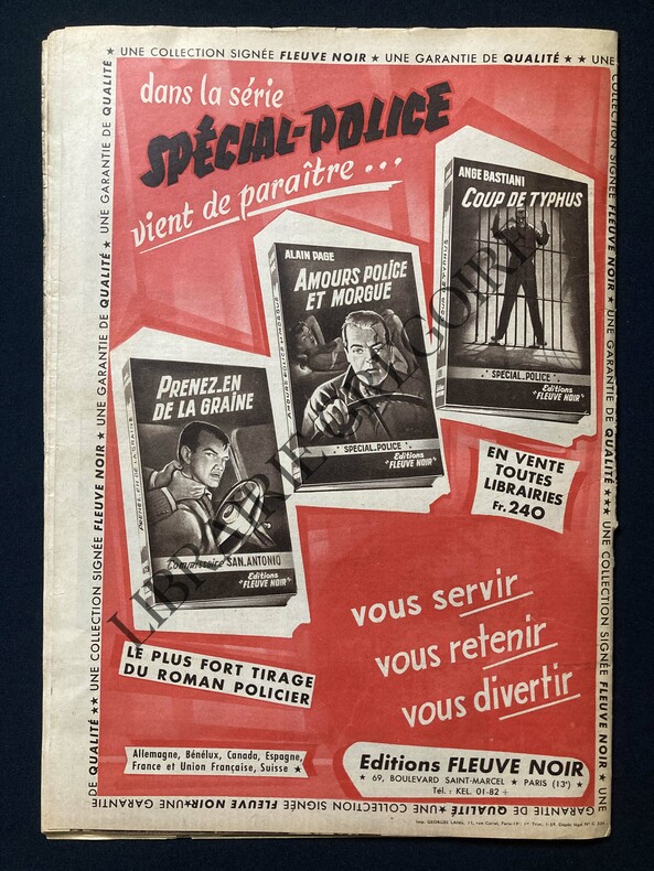 FORMAT 28,5 CM X 40,5 CM-28 PAGES-EN COUVERTURE: JOSEPH JOANOVICI-LA PRISON POUR JOANOVICI; GRANDE PHOTO DANS SA CABINE SUR LE THEODOR HERZL AVEC CHARLES DELAUNEY ET PLUSIEURS PHOTOS LORS DE SON ACCOSTAGE A MARSEILLE, 3P-MONTAUBAN (TARN ET GARONNE): MEURTRE D'YVONNE DUTIL PAR EDOUARD TERRIE, 1P-THIERS (PUY DE DOME): HOMICIDES D'AIMEE MOULIN ET ROLAND OLAGNIER PAR PHILIPPE REINHARDT "LE CHAUFFEUR GITAN", 1P-LOS ANGELES (CALIFORNIE, U.S.A.): LA DEMONIAQUE ELISABETH DUNCAN, 2P-NICE (ALPES MARITIMES): JEAN SUSINI FAIT REPARLER DE LUI, 1P-SICHEM (BELGIQUE): DANS LA CHAMPIGNONNIERE LA VOUTE S'ECROULA, 4 PHOTOS: UNE DU SURVIVANT LOUIS PALMANS, UNE DE LA RESCAPEE JOHANNA AUDENESS, UNE DU ROI BAUDOUIN SUR LES LIEUX DE LA CATASTROPHE, 1P-MARSEILLE (BOUCHES DU RHONE): MORT DE ROGER FROIDEVAUX LORS D'UN SAUT DANS LE VIEUX PORT, 4 PHOTOS, 1P-RODEREN (HAUT-RHIN): RETOUR EN FRANCE DU PERE JOSEPH SOHLER, MISSIONNAIRE AU CAMEROUN, PLUSIEURS PHOTOS, 3P-LE COMBAT SANS FIN DE FLORIMOND VERCRUYSSEN CONTRE LA SEINE, 1P-SUZANNE FLON PORTE CHANCE, 4 PHOTOS, 1P-FORTUNE LACROIX, LE PORTIER DE L'ELYSEE, PREND SA RETRAITE, 3 PHOTOS, 1P-LES REQUINS SE PECHENT LA NUIT; REPORTAGE PHOTO A L'OCCASION DE LA SORTIE DU FILM "LE VIEIL HOMME ET LA MER", 2P-