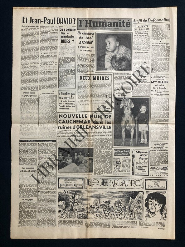 6 PAGES-43 CM X 60 CM-EN UNE: DELEGATIONS DE PLUS EN PLUS NOMBREUSES POUR BARRER LA ROUTE A LA WEHRMACHT, 3 PHOTOS-ACCORD A L'ONU SUR L'ORDRE DU JOUR DES TRAVAUX DU COMITE DU DESARMEMENT-MARCEL CACHIN CHEZ PICASSO, PHOTO 9 CM X 12,3 CM (LES 2 DANS LE JARDIN DE VALLAURIS)-P3: HIER AU PALAIS DE CHAILLOT ADENAUER A SIEGE POUR LA PREMIERE FOIS AU CONSEIL ATLANTIQUE, 1/2 PAGE, CARTE-P4: SANS INTERRUPTION AU PALAIS DE CHAILLOT-PETITES TACHES D'ENCRE (MOTS CROISES)