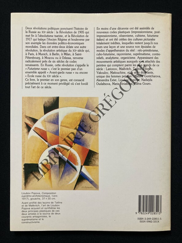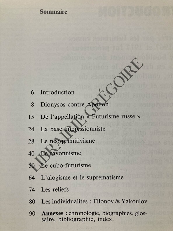 Dessain & Tolra, Paris, 1989. In-4, broché sous couverture rempliée et illustrée en couleurs, 111 pp. Introduction - Dionysos contre Apollon - De l'appellation "Futurisme russe" - La base impressionniste - Le néo-primitivisme - Le rayonnisme - Le cubo-futurisme - L'alogisme et le suprématisme - Les reliefs - Les individualités : Filonov et Yakoulov - Annexes ...