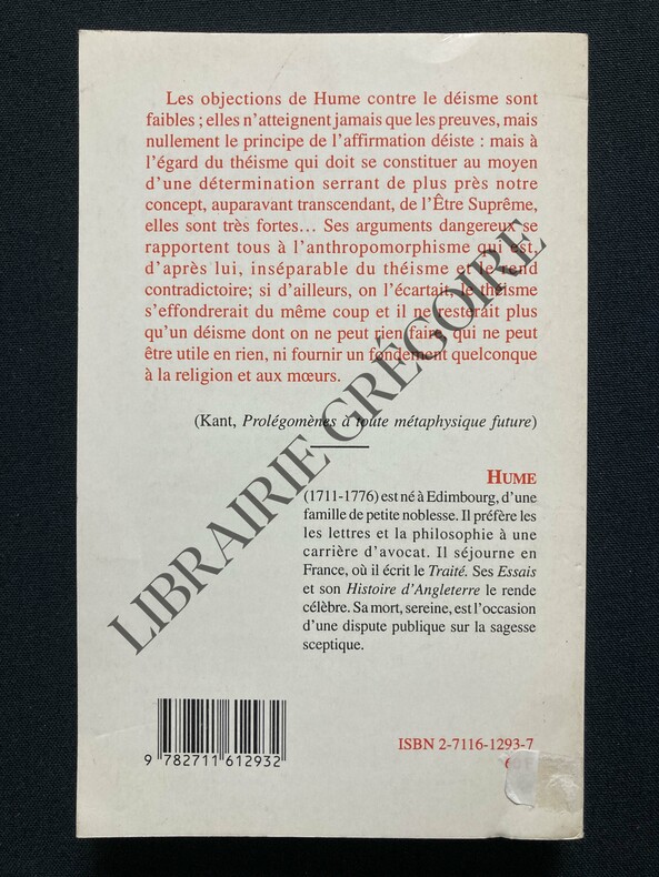 nouvelle édition 1973 de cette traduction qui date de 1912 "Contents, Chapitres : Les Dialogues sur la religion naturelle sont la dernière oeuvre du philosophe britannique David Hume, publiée à titre posthume et anonymement en 1779. Rédigés à partir de 1750 et achevés peu avant sa mort, ces dialogues traitent de la nature de la religion et trouvent une partie de leur inspiration dans le De Natura Deorum de Cicéron. Dans ce dialogue en douze chapitres, trois personnages de fiction nommés Déméa, Philon et Cléanthe, débattent de la nature et de l'existence de Dieu. Les trois sont d'accord sur le fait qu'un dieu existe (ou puisse exister) ; cependant, ils diffèrent sur la manière qu'ils estiment la plus pertinente de raisonner au sujet des attributs et des qualités de Dieu, ainsi que sur la possibilité pour l'humanité d'acquérir un savoir sur l'Être suprême. Au fil des chapitres, les personnages du dialogue abordent un certain nombre d'arguments au sujet de l'existence de Dieu, ainsi que des arguments dont leurs défenseurs estiment qu'ils pourraient leur permettre de connaître la nature de la divinité. Ces débats incluent l'argument du dessein intelligent - pour lequel Hume donne l'exemple d'une maison - ou la question de savoir s'il y a davantage de bien ou de mal dans le monde. Dans l'Enquête sur l'entendement humain, le chapitre X, Des miracles, réfute a priori la possibilité que les miracles existent, puis démontre que la croyance religieuse se fonde essentiellement sur la foi et non sur la raison. Et dans l'Histoire naturelle sur la religion, Hume explique historiquement l'apparition de la religion, sans chercher son origine dans une quelconque transcendance a priori - ce qui tend à montrer que la religion est une production de l'esprit humain et non d'une transcendance supra-humaine. (source : Wikipedia)" couverture à peine jaunie, avec une légère éraflure à peine visible sur le haut du plat supérieur, sinon bon état, intérieur frais et propre, papier à peine jauni, cela reste un bon exemplaire