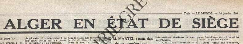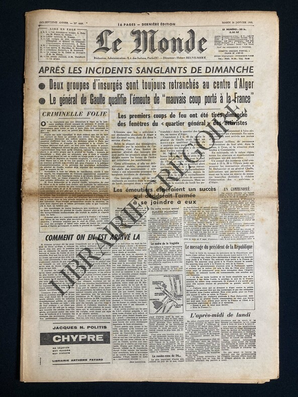 FORMAT 35 CM X 50 CM-16 PAGES-ALGER: APRES LES INCIDENTS SANGLANTS DE DIMANCHE-LE FILM DES EVENEMENTS A ALGER EN ETAT DE SIEGE, 2P-LES PREMIERES REACTIONS EN FRANCE ET DANS LE MONDE APRES LES JOURNEES D'ALGER, 1,5P-QUELQUES REFLEXIONS SUR L'AFFAIRE MASSU-LE JAILLISSEMENT DE PETROLE DE DIAM NIADIE CONFIRME L'INTERET DU BASSIN DU SENEGAL-LES CONVERSATIONS ADENAUER SEGNI A ROME N'ONT ETE QU'UN DEMI SUCCES-NOUVELLES ATTAQUES POLONAISES CONTRE L'ALLEMAGNE OCCIDENTALE A L'OCCASION DE LA COMMEMORATION DU QUINZIEME ANNIVERSAIRE DE LA LIBERATION DU CAMP D'AUSCHWITZ-DUNKERQUE, VILLE PILOTE DE L'EXPANSION FRANCAISE, 1P-MILLIEME REPRESENTATION DE "MADAME BUTTERFLY" A L'OPERA COMIQUE-SECONDE SEMAINE DU PROCES JACCOUD-QUELQUES ROUSSEURS EN UNE-