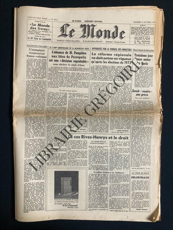 40 PAGES-34 CM X 50 CM-EN UNE: L'ABSENCE DE M. POMPIDOU AUX FETES DE PERSEPOLIS EST UNE "DECISION REGRETTABLE" NOUS DECLARE LE CHAH D'IRAN-LE CAS RIVES-HENRYS ET LE DROIT, PAR ROGER-GERARD SCHWARTZENBERG, SUITE P15-P3: IRAN LES DECLARATIONS DU CHAH-P8 P9 LA REFORME REGIONALE EN VIGUEUR APRES LES ELECTIONS DE 1973-P15: AUX ASSISES DE LA HAUTE-GARONNE QUINZE ANS DE RECLUSION CRIMINELLE POUR RENE VIGNAL (VIGNAL SOULIGNE EN ROUGE)-P17: LES AVEUX DE DON JUAN "MEMOIRE D'UN AMNESIQUE", DE JACQUES LANZMANN-UNE REHABILITATION DU "SENTIR" LA TRINITE SPIRITUELLE DE LANZA DEL VASTO-ETUDE: WILLIAM BLAKE ET NOUS, 2 PAGES-P24: L'ENFANT ET LA PSYCHANALYSE "LE CAS DOMINIQUE" DE FRANCOISE DOLTO-P26: LES VARIETES, PAR CLAUDE SARRAUTE: NANA MOUSKOURI, OLYMPIA-LE 58e SALON DE L'AUTOMOBILE, 3 PAGES, ALPINE RENAULT, PHOTO A310, LIGIER, PHOTO JS 2, CITROEN, PHOTO BREAK GS-MARGE DROITE DE UNE INSOLEE EN PARTIE SUP