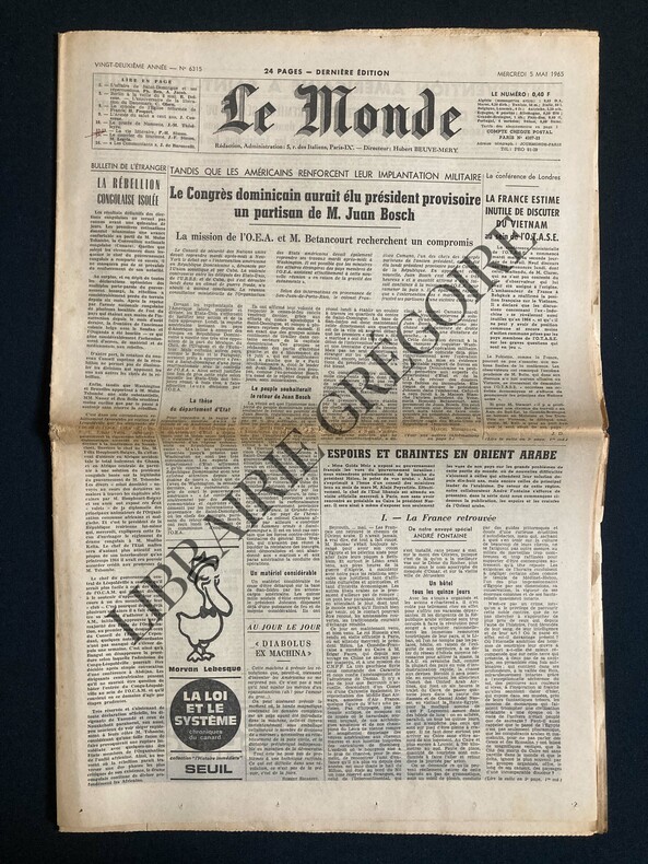 24 PAGES-34 CM X 50 CM-BULLETIN DE L'ETRANGER LA REBELLION CONGOLAISE ISOLEE-ESPOIRS ET CRAINTES EN ORIENT ARABE I LA FRANCE RETROUVEE, PAR ANDRE FONTAINE, SUITE P5-P2: L'INTERVENTION AMERICAINE A SAINT-DOMINGUE-P3: IL Y A VINGT ANS LE DANEMARK ETAIT LIBERE, PAR CAMILLE OLSEN-P9: L'ARMEE DU SALUT A CENT ANS, DEMI PAGE-P10: JOURNEE D'INTERROGATOIRE AU PROCES DE GASTON NAESSENS, DEMI PAGE