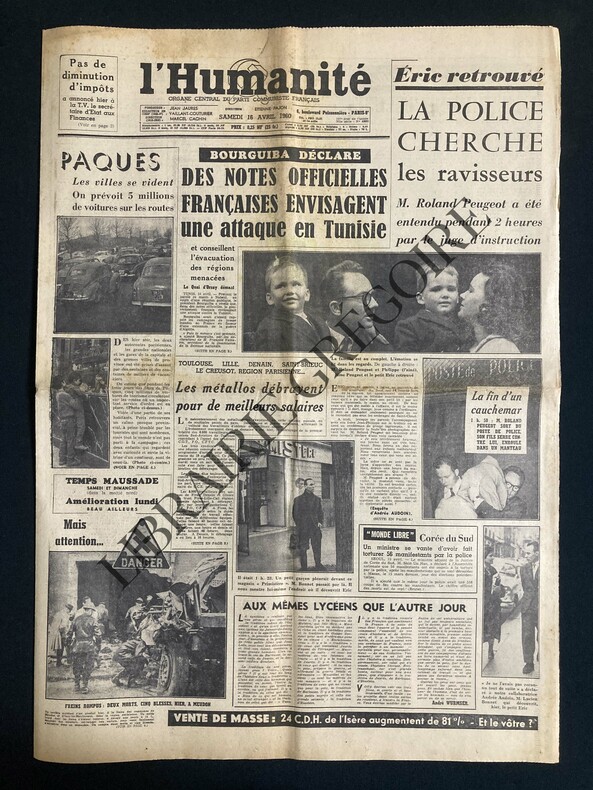 6 PAGES-43 CM X 60 CM-EN UNE: BOURGUIBA DECLARE DES NOTES OFFICIELLES FRANCAISES ENVISAGENT UNE ATTAQUE EN TUNISIE ET CONSEILLENT L'EVACUATION DES REGIONS MENACEES LE QUAI D'ORSAY DEMENT-ERIC RETROUVE LA POLICE CHERCHE LES RAVISSEURS M. ROLAND PEUGEOT A ETE ENTENDU PENDANT 2 HEURES PAR LE JUGE D'INSTRUCTION, 3 PHOTOS (LE COUPLE ET SES 2 ENFANTS-LA FIN D'UN CAUCHEMAR-LUCIEN BONNET)-P2: LE BARON DE L'ECLUSE, FILM FRANCAIS DE JEAN DELANNOY (GABIN TEL QU'EN LUI-MEME.), 1/5 PAGE, PHOTO (JEAN GABIN ET MICHELINE PRESLE)-PROGRAMME DE CLOTURE A BOBINO PIA COLOMBO FAIT HONNEUR A SON "PARRAIN" GEORGES BRASSENS-P6: "JOYEUSES PAQUES" CHEZ LES PEUGEOT, DEMI-PAGE, 4 PHOTOS-ERIC RETROUVE ON POURCHASSE MAINTENANT CEUX QUI L'ONT ENLEVE, LA FIN D'UN CAUCHEMAR, 1/4 PAGE, PHOTO