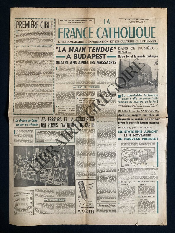 8 PAGES-43 CM X 60 CM-EN UNE: "LA MAIN TENDUE" A BUDAPEST QUATRE ANS APRES LES MASSACRES-LE DRAME DE CUBA VU PAR UN TEMOIN LES ERREURS ET LA CORRUPTION ONT PERMIS L'AVENEMENT DE CASTRO, PHOTO-P2: LE "CINEMA-OEUVRE": L'AVVENTURA-LE THEATRE: TENNESSEE WILLIAMS ET LE THEATRE AMERICAIN D'AUJOURD'HUI-P5: DERNIERS COMBATS ELECTORAUX AVANT LA VICTOIRE OU LA DEFAITE DE L'ADMINISTRATION AMERICAINE-P8: A CUBA, LES ERREURS ET LA CORRUPTION ONT PERMIS L'AVENEMENT DE CASTRO-(PJ2-
