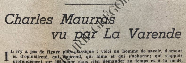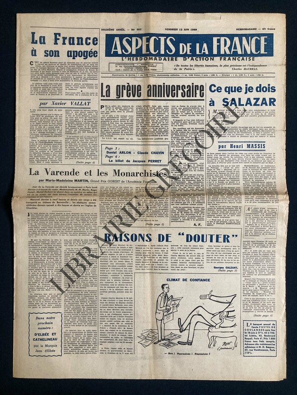 6 PAGES-43 CM X 60 CM-EN UNE: LA FRANCE A SON APOGEE, PAR XAVIER VALLAT, SUITE P4-LA VARENDE ET LES MONARCHISTES, PAR MARIE-MADELEINE MARTIN, SUITE P5-CE QUE JE DOIS A SALAZAR, PAR HENRI MASSIS, SUITE P4-DESSIN DE BEN (CLIMAT DE CONFIANCE), M DEBRE, CH DE GAULLE-P5: JEAN DE LA VARENDE, PAR ROGER JOSEPH, UN JUGEMENT DE LEON DAUDET, VU PAR CHARLES MAURRAS, CHARLES MAURRAS VU PAR LA VARENDE