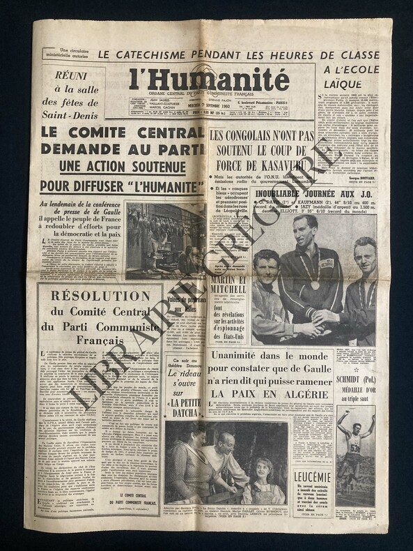 8 PAGES-43 CM X 60 CM-EN UNE: LES CONGOLAIS N'ONT PAS SOUTENU LE COUP DE FORCE DE KASAVUBU, SUITE P3COMMUNISTE FRANCAIS-UNANIMITE DANS LE MONDE POUR CONSTATER QUE DE GAULLE N'A RIEN DIT QUI PUISSE RAMENER LA PAIX EN ALGERIE, SUITE P4-INOUBLIABLE JOURNEE AUX J.O., PHOTO (JAZY-KAUFMANN-ELLIOTT)-P2: LES JEUX SONT FAITS A VENISE "PASSAGE DU RHIN" "ROCCO ET SES FRERES" DE VISCONTI CANDIDATS SERIEUX AU "LION D'OR", QUART DE PAGE, PHOTO VISCONTI DIRIGEANT ANNIE GIRARDOT ET ALAIN DELON-P3: ALGERIE LES OPERATIONS MILITAIRES SE MULTIPLIENT DANS LE CONSTANTINOIS-P6: ELECTROLUX HUIT MOIS DE MARCHE COMMUN "EXPLOSION DE POSSIBILITES" POUR LA SOCIETE "LICENCIEMENTS POUR LES TRAVAILLEURS", PHOTO USINE DE COURBEVOIE, 1/4 PAGE-P8: DEUX SENSATIONNELLES FINALES DEUX RECORDS MONDIAUX BATTUS! 400 METRES 1500 METRES, PHOTO LOTIS DAVIS-A RAFER JOHNSON LE TITRE DU DECATHLON, PHOTO