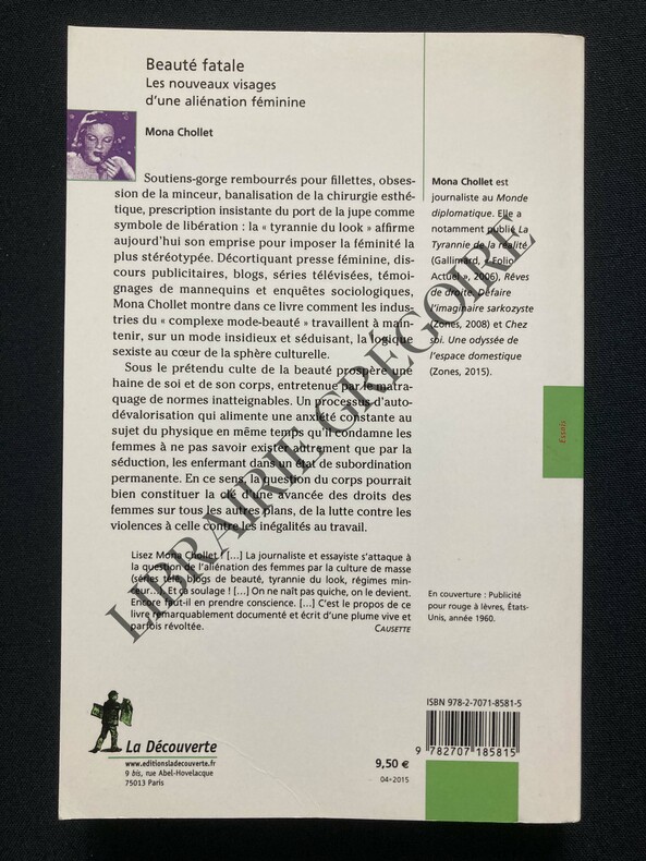 Soutiens-gorge rembourrés pour fillettes, obsession de la minceur, banalisation de la chirurgie esthétique, prescription insistante du port de la jupe comme symbole de libération : la " tyrannie du look " affirme aujourd'hui son emprise pour imposer la féminité la plus stéréotypée. Décortiquant presse féminine, discours publicitaires, blogs, séries télévisées, témoignages de mannequins et enquêtes sociologiques, Mona Chollet montre dans ce livre comment les industries du " complexe mode-beauté " travaillent à maintenir, sur un mode insidieux et séduisant, la logique sexiste au cœur de la sphère culturelle.<br data-mce-fragment="1"> Sous le prétendu culte de la beauté prospère une haine de soi et de son corps, entretenue par le matraquage de normes inatteignables. Un processus d'auto-dévalorisation qui alimente une anxiété constante au sujet du physique en même temps qu'il condamne les femmes à ne pas savoir exister autrement que par la séduction, les enfermant dans un état de subordination permanente. En ce sens, la question du corps constitue bien la clé d'une avancée des droits des femmes sur tous les autres plans, de la lutte contre les violences à celle contre les inégalités au travail. Paris, 2015 La découverte 296 p ., broché. 126 x 191 mm