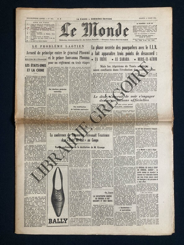 16 PAGES-35 CM X 50 CM-EN UNE: LE PROBLEME LAOTIEN-LA PHASE SECRETE DES POURPARLERS AVEC LE FLN A FAIT APPARAITRE TROIS POINTS DE DESACCORD-LA CONFERENCE DE TANANARIVE RECONNAIT L'EXISTENCE DES "ETATS DE FAIT" AU CONGO-P5: APRES LES ENTRETIENS D'HASSAN II UN REMANIEMENT MINISTERIEL AU MAROC NE PARAIT PAS IMMINENT-P6: LES PERSPECTIVES DE NEGOCIATIONS ET LA SITUATION EN ALGERIE-P7: L'AFFAIRE DU C.N.L.-P8: LE "CHARABIA" N'EST PLUS RESERVE AUX AUVERGNATS-P13: VARIETES, PAR CLAUDE SARRAUTE: LE RECITAL CHARLES TRENET A L'ETOILE-P16: L'ENQUETE SUR L'AFFAIRE PEUGEOT ROLLAND ET LARCHER N'ONT EU AUCUN COMPLICE POUR ECOUTER LES BILLETS DE LA RANCON-JAUNI EN PLIURE CENTRALE DE UNE