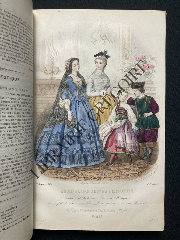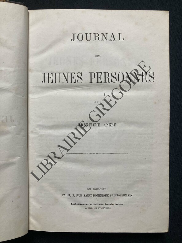 388 PAGES-12 NUMEROS DE 34 PAGES-N°1 NOVEMBRE 1861-DECEMBRE 1861-JANVIER 1862-FEVRIER 1862-MARS 1862-AVRIL 1862-MAI 1862-JUIN 1862-JUILLET 1862-AOUT 1862-SEPTEMBRE 1862-OCTOBRE 1862-11 GRAVURES PLEINE PAGE EN COULEURS-2 GRAVURES NOIR ET BLANC PLEINE PAGE-RELIURE DOS CUIR-TITRES ET ORNEMENTS DORES-PLATS CARTONNES-(300E)
