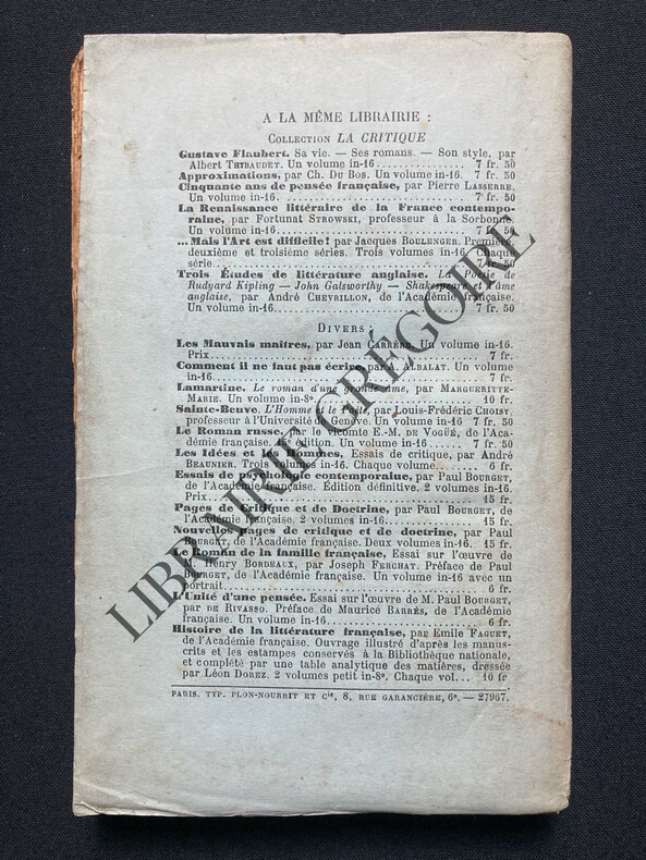 Paris, Plon-Nourrit et Cie, Imprimeurs-Editeurs, 1922. 12 x 19, 242 pp., broché, état moyen (couverture, défraîchie, papier jauni).