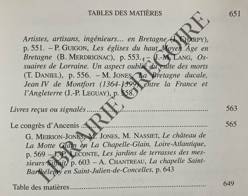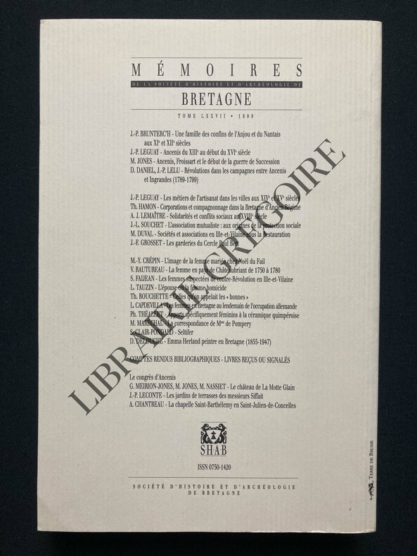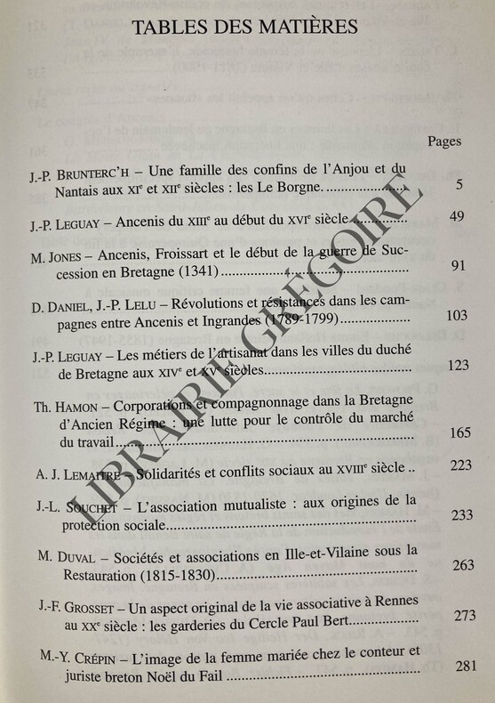 FORT IN 8-652 PAGES-UNE FAMILLE DES CONFINS DE L'ANJOU ET DU NANTAIS AUX XIe ET XIIe SIECLES: LES LE BORGNE-ANCENIS DU XIIIe AU DEBUT DU XVIe SIECLE-ANCENIS, FROISSART ET LE DEBUT DE LA GUERRE DE SUCCESSION EN BRETAGNE (1341)-REVOLUTIONS ET RESISTANCES DANS LES CAMPAGNES ENTRE ANCENIS ET INGRANDES (1789-1799)-LES METIERS DE L'ARTISANAT DANS LES VILLES DU DUCHE DE BRETAGNE AUX XIVe ET XVe SIECLES-CORPORATIONS ET COMPAGNONNAGE DANS LA BRETAGNE D'ANCIEN REGIME: UNE LUTTE POUR LE CONTROLE DU MARCHE DU TRAVAIL-SOLIDARITE ET CONFLITS SOCIAUX AU XVIIIe SIECLE-L'ASSOCIATION MUTUALISTE AUX ORIGINES DE LA PROTECTION SOCIALE-SOCIETES ET ASSOCIATIONS EN ILLE-ET-VILAINE SOUS LA RESTAURATION (1815-1830)-UN ASPECT ORIGINAL DE LA VIE ASSOCIATIVE A RENNES AU XXe SIECLE: LES GARDERIES DU CERCLE PAUL BERT-L'IMAGE DE LA FEMME MARIEE CHEZ LE CONTEUR ET JURISTE BRETON NOEL DU FAIL-LA FEMME EN PAYS DE CHATEAUBRIANT DE 1750 A 1780-LES FEMMES SUSPECTEES DE CONTRE-REVOLUTION EN ILLE-ET-VILAINE (1793-1795)-L'EPOUSE OU LA FEMME HOMICIDE L'EXEMPLE DE LA COUR D'ASSISES D'ILLE-ET-VILAINE (1811-1900)-CELLES QU'ON APPELAIT LES "BONNES"-LES FEMMES EN BRETAGNE AU LENDEMAIN DE L'OCCUPATION ALLEMANDE: UNE LIBERATION INACHEVEE-PEUT-ON DETERMINER DES APPORTS SPECIFIQUEMENT FEMININS A LA CERAMIQUE QUIMPEROISE?-LA CORRESPONDANCE DE MME DE POMPERY: OCCUPATIONS, LOISIRS ET PASSIONS D'UNE QUIMPEROISE A LA FIN DU XVIIIe SIECLE-SELTIFER: UNE FEMME CRITIQUE MUSICALE A NANTES AU DEBUT DU XXe SIECLE-EMMA HERLAND, PEINTRE EN BRETAGNE (1855-1947)-COMPTES RENDUS BIBLIOGRAPHIQUES-LE CHATEAU DE LA MOTTE GLAIN EN LA CHAPELLE-GLAIN, LOIRE-ATLANTIQUE-LES JARDINS DE TERRASSES DES MESSIEURS SIFFAIT-LA CHAPELLE SAINT-BARTHELEMY EN SAINT-JULIEN-DE-CONCELLES-(200D)