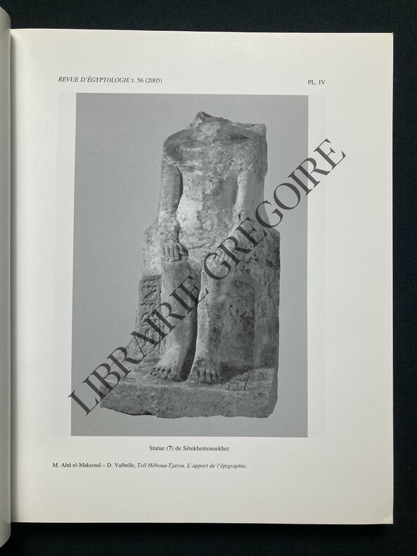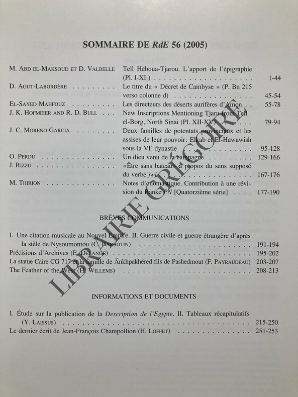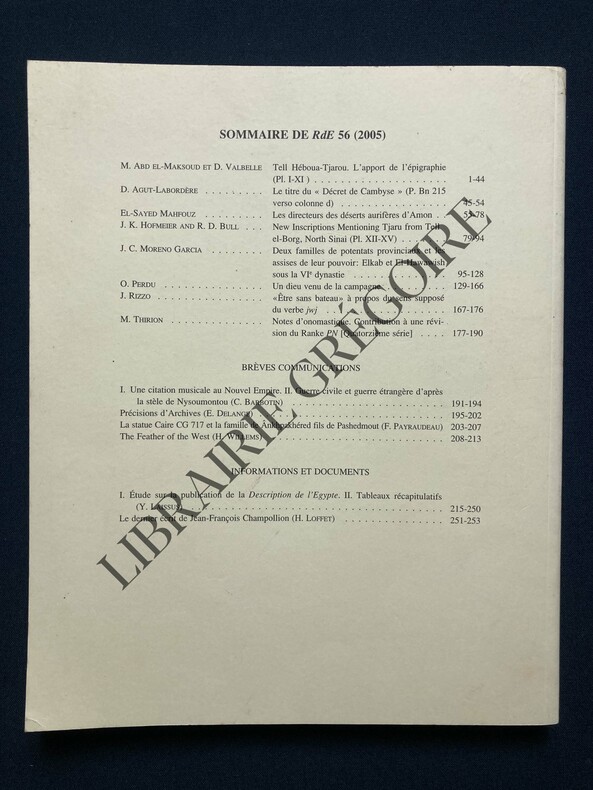 Editions Peeters Revue en brochure d'éditeur 2005 In-4 (22 x 27 cm.), revue en brochure d'éditeur, 253 pages, illustrations et planches en noir, Tome 56 de la Revue d'égyptologie, publiée par la Société Française d'Égyptologie avec le concours du centre national de la recherche scientifique, certains articles en langue étrangère ; légères traces aux plats, un peu incurvé, très bon état. Livraison a domicile (La Poste) ou en Mondial Relay sur simple demande.