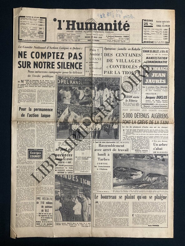 6 PAGES-42,5 CM X 60 CM-EN UNE: LE COMITE NATIONAL D'ACTION LAIQUE A DEBRE: NE COMPTEZ PAS SUR NOTRE SILENCE NOUS MENERONS CAMPAGNE POUR LA DEFENSE DE L'ECOLE PUBLIQUE-POUR DEFENDRE LEUR DIGNITE D'HOMME 5.000 DETENUS ALGERIENS FONT LA GREVE DE LA FAIM, SUITE P4-LE BOURREAU SE PLAINT QU'ON SE PLAIGNE, JEAN MARIE LE PEN-A PARIS PARC MONCEAU UN ARBRE S'ABAT SIX BLESSES, PHOTO, SUITE P6-P2: LOUIS DE FUNES (45 ANS CETTE SEMAINE ET 81 FILMS) TRAVAILLE "POUR UN MILLIARD", PHOTO 9 CM X 13,5 CM-P3: ALGERIE DES CENTAINES DE VILLAGES "CONTROLES" PAR LA TROUPE EN KABYLIE-NOUVELLE TENSION DANS LES RAPPORTS FRANCO-MAROCAINS DES DIVERGENCES OPPOSENT MOHAMMED V AU CABINET IBRAHIM