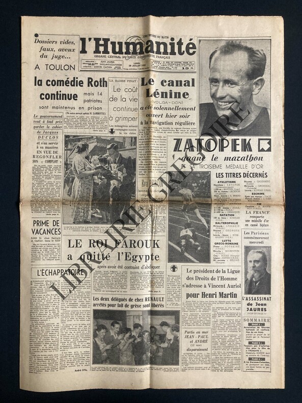 8 PAGES-42,5 CM X 60 CM-P1: A TOULON LA COMEDIE ROTH CONTINUE, SUITE P4-LA BAISSE PINAY LE COUT DE LA VIE CONTINUE A GRIMPER, PHOTO-LE CANAL LENINE (VOLGA-DON) A ETE SOLENNELLEMENT OUVERT HIER SOIR A LA NAVIGATION REGULIERE-EVA PERON FEMME DU DICTATEUR ARGENTIN EST MORTE-LE ROI FAROUK A QUITTE L'EGYPTE-ZATOPEK GAGNE LE MARATHON ET SA TROISIEME MEDAILLE D'OR, PHOTO 12 CM X 15,5 CM-LES PARISIENS COMMEMORERONT MERCREDI L'ASSASSINAT DE JEAN JAURES, PHOTO-LE PRESIDENT DE LA LIGUE DES DROITS DE L'HOMME S'ADRESSE A VINCENT AURIOL POUR HENRI MARTIN-P3: APRES L'ABDICATION DE FAROUK-P8: JO HELSINKI, 1P, 3 PHOTOS (ZATOPEK-EVA NOVAK-VDODOV)