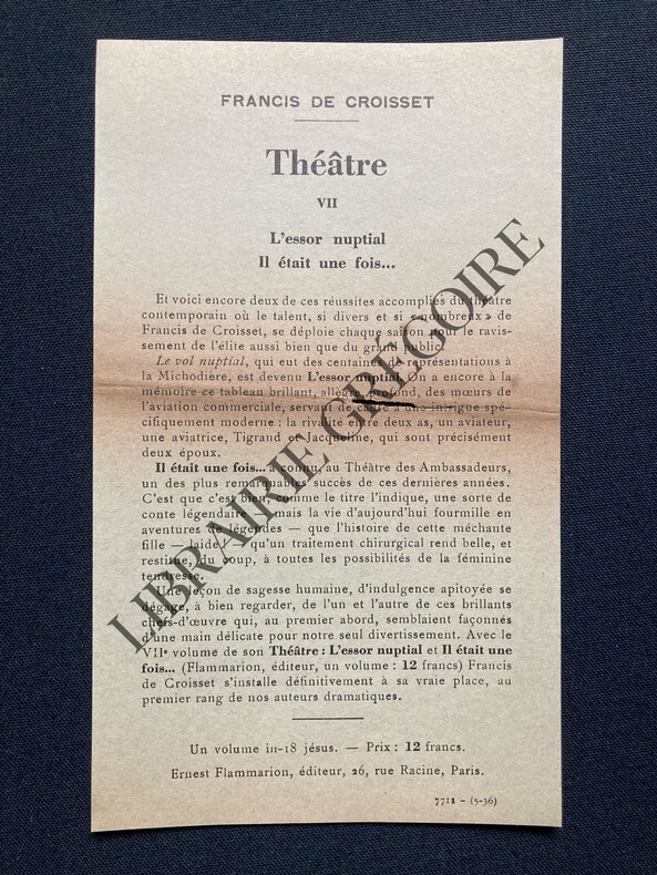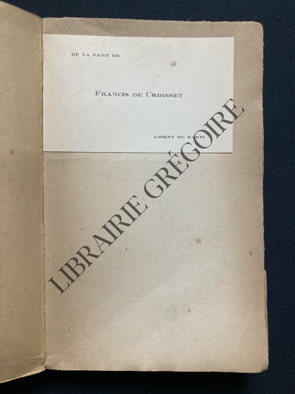 BROCHE-260 PAGES-12 CM X 18,7 CM-EXEMPLAIRE SERVICE DE PRESSE-PRIERE D'INSERER-CARTE DE VISITE DE L'AUTEUR AVEC MENTIONS IMPRIMEES "DE LA PART DE FRANCIS DE CROISSET ABSENT DE PARIS" SANS MENTION MANUSCRITE-NON COUPE-(JDG7)