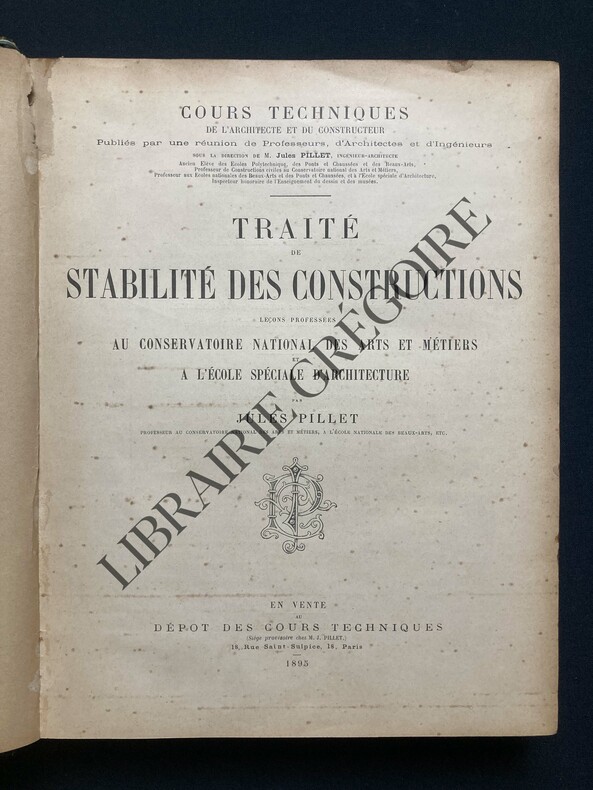 Traité de stabilité des constructions, Leçons professées au conservatoire national des arts et métiers a l'école spéciale d'architecture de Jules Pillet chez Dépôt des cours techniques, Cours techniques de l'architecte et du constructeur en 1895. Le livre est illustré de 515 figures. Le livre mesure 26x32 cm et pèse 3,200 kg (c) pour 477 + LVI pages. Reliure d'époque cartonnée. Le livre est en état d’usage, très bon, bords coins frottés.