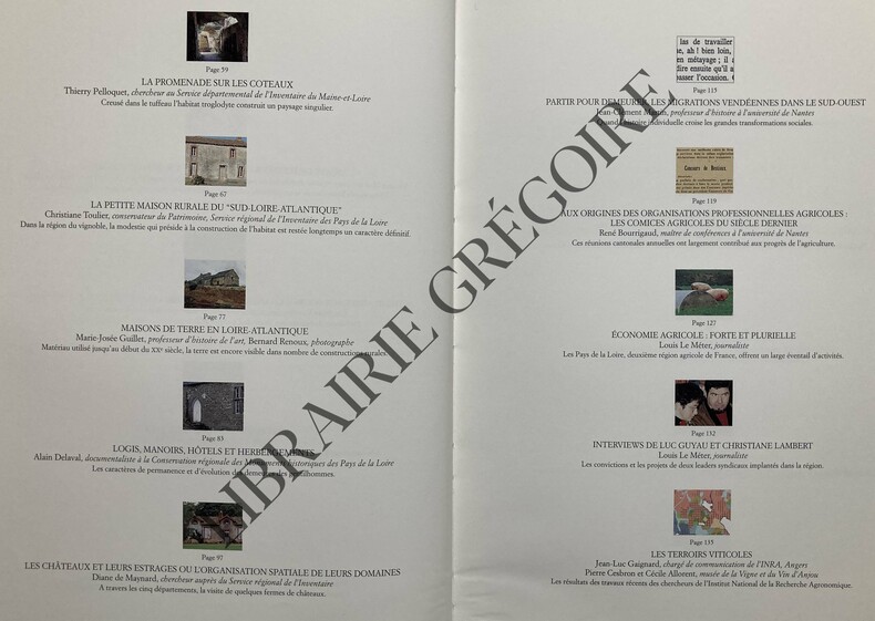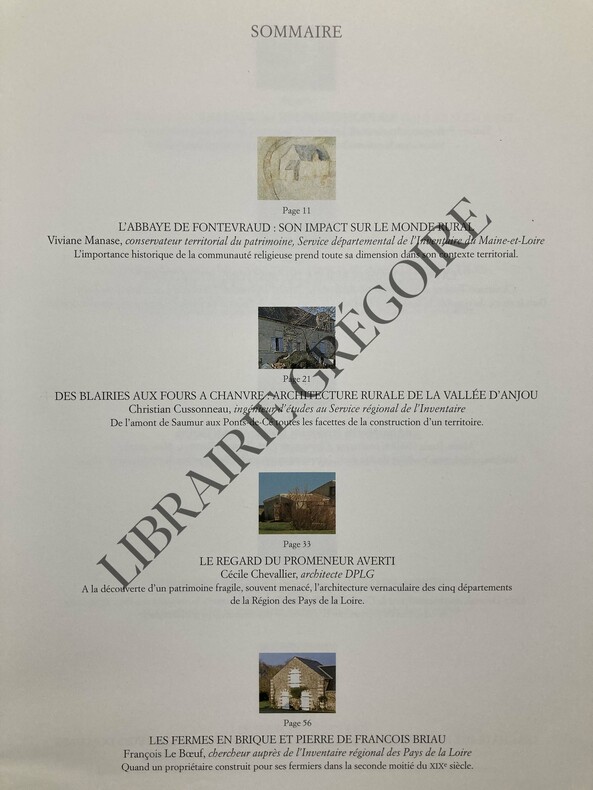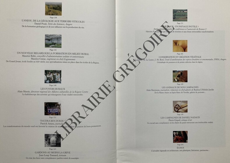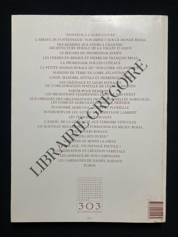 216 PAGES-22,6 CM X 30 CM-L'ABBAYE DE FONTEVRAUD: SON IMPACT SUR LE MONDE RURAL-DES BLAIRIES AUX FOURS A CHANVRE: ARCHITECTURE RURALE DE LA VALLEE D'ANJOU-LE REGARD DU PROMENEUR AVERTI-LES FERMES EN BRIQUE ET PIERRE DE FRANCOIS BRIAU-LA PROMENADE SUR LES COTEAUX-LA PETITE MAISON RURALE DU "SUD-LOIRE-ATLANTIQUE"-MAISONS DE TERRE EN LOIRE-ATLANTIQUE-LOGIS, MANOIRS, HOTELS ET HEBERGEMENTS-LES CHATEAUX ET LEURS ESTRAGES OU L'ORGANISATION SPATIALE DE LEURS DOMAINES-PARTIR POUR DEMEURER, LES MIGRATIONS VENDEENNES DANS LE SUD-OUEST-AUX ORIGINES DES ORGANISATIONS PROFESSIONNELLES AGRICOLES: LES COMICES AGRICOLES DU SIECLE DERNIER-ECONOMIE AGRICOLE: FORTE ET PLURIELLE-INTERVIEW DE LUC GUYAU ET CHRISTIANE LAMBERT-LES TERROIRS VITICOLES-L'ANJOU, DE LA GEOLOGIE AUX TERROIRS VITICOLES-UN NOUVEAU REGARD SUR LA FORMATION EN MILIEU RURAL-LES FOYERS RURAUX-"FAUDRA BEN DURER!"-GARDONS AU MOINS LA GRIVE-LE BOCAGE: UN PAYSAGE INUTILE?-CONSERVATION ET CREATION VEGETALE-LES ANIMAUX DE NOS CAMPAGNES-LES CAMPAGNES DE DANIEL NADAUD-(11F)