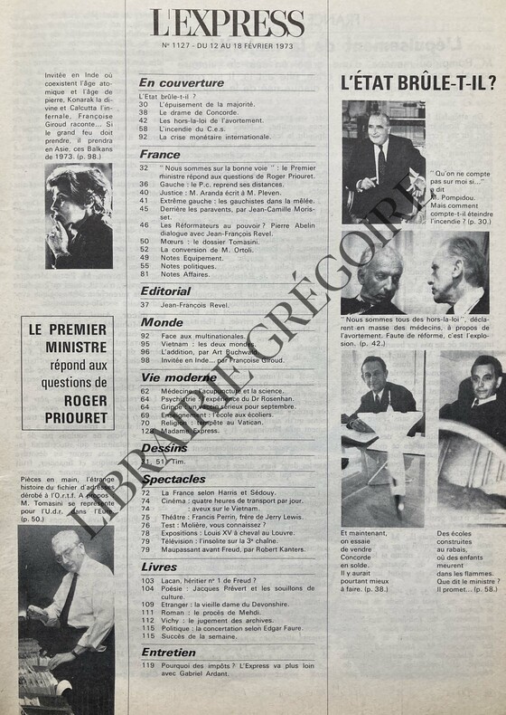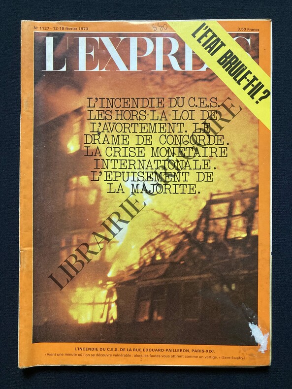 EN UNE: L'INCENDIE DU CES DE LA RUE EDOUARD PAILLERON-FRANCE: L'EPUISEMENT DE LA MAJORITE, PAR GUY CLAISSE ET CATHERINE NAY, 2 PAGES, DESSIN POMPIDOU PAR TIM-LE PREMIER MINISTRE REPOND AUX QUESTIONS DE ROGER PRIOURET "NOUS SOMMES SUR LA BONNE VOIE", 4 PAGES-GAUCHE LE P.C. REPREND SES DISTANCES, PAR MICHELE COTTA, 1P, PHOTO (G MARCHAIS-RENE PIQUET)-L'ETAT BRULE-T-IL?, PAR JEAN-FRANCOIS REVEL, 1P-AERONAUTIQUE: LE DRAME DE CONCORDE, 2 PAGES, 2 PAGES-EXTREME GAUCHE LES GAUCHISTES DANS LA MELEE, 1P, 2 PHOTOS (ALAIN KRIVINE-MEETING DE LA LIGUE COMMUNISTE)-SOCIETE LES HORS-LA-LOI DE L'AVORTEMENT, 3 PAGES, 5 PHOTOS-JEAN-FRANCOIS REVEL DIALOGUE AVEC PIERRE ABELIN LES REFORMATEURS AU POUVOIR?, 3 PAGES, 2 PHOTOS-MOEURS: LE DOSSIER TOMASINI, PAR JACQUES DEROGY, 3 PAGES, DESSIN DE TIM-VIE MODERNE: LES ECOLES QUI TUENT, 4 PAGES, 13 PHOTOS-MEDECINE: L'ACUPUNCTURE ET LA SCIENCE, 2 PAGES, 6 PHOTOS-SPECTACLES: LA FRANCE SELON HARRIS ET SEDOUY, 2 PAGES-CINEMA: QUATRE HEURES DE TRANSPORT PAR JOUR "ELLE COURT, ELLE COURT, LA BANLIEUE" DE GERARD PIRES, 1P, PHOTO MARTHE KELLER-THEATRE: FRANCIS PERRIN, FRERE DE JERRY LEWIS, "CITRON AUTOMATIQUE", 2 PHOTOS-TEST: MOLIERE, VOUS CONNAISSEZ?, 2 PAGES-EXPOSITIONS: LOUIS XV A CHEVAL AU LOUVRE, EDME BOUCHARDON, 1P, 2 ILL-MONDE: FACE AUX MULTINATIONALES, SUR 4 PAGES-VIETNAM: LES DEUX MONDES, 3 PAGES, PHAN THI KIM PHUC-INVITEE EN INDE., PAR FRANCOISE GIROUD, 3 PAGES-LIVRES: LACAN, HERITIER N°1 DE FREUD?, PAR DOMINIQUE FERNANDEZ, SUR 2 PAGES, PHOTO-POESIE: JACQUES PREVERT ET LES SOUILLONS DE CULTURE, 1P, PHOTO-ETRANGER: LA VIEILLE DAME DU DEVONSHIRE, JEAN RHYS, PAR ANGELO RINALDI, SUR 2 PAGES, 3 PHOTOS-POURQUOI DES IMPOTS? L'EXPRESS VA PLUS LOIN AVEC GABRIEL ARDANT, 7 PAGES
