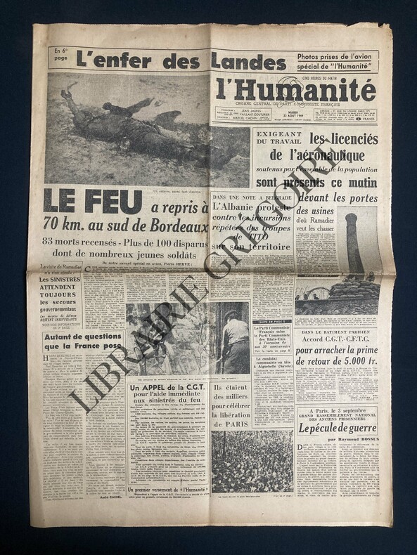 6 PAGES-43 CM X 60 CM-EN UNE: L'ENFER DES LANDES LE FEU A REPRIS A 70 KM AU SUD DE BORDEAUX, PHOTO "UN CADAVRE, PARMI TANT D'AUTRES"-DANS UNE NOTE A BELGRADE L'ALBANIE PROTESTE CONTRE LES INCURSIONS REPETEES DES TROUPES DE TITO SUR SON TERRITOIRE-P3: LE FEU REPREND AVEC VIOLENCE 70 KM AU SUD DE BORDEAUX-DERNIERE PAGE: L'ENFER DES LANDES VU DE L'AVION SPECIAL DE "L'HUMANITE", 6 PHOTOS