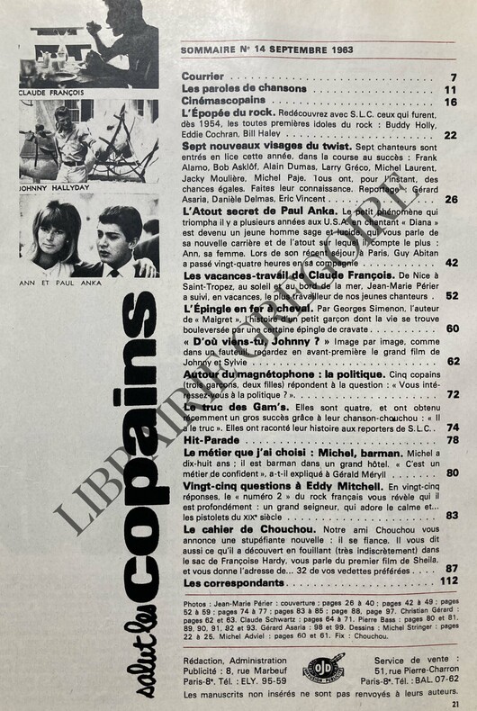 116 PAGES-IN 4-GARCONS: VOICI LES 7 PARTANTS 1964 (JACKY MOULIERE-LARRY GRECO-MICHEL LAURENT-MICHEL PAJE-BOB ASKLOF-FRANK ALAMO-ALAIN DUMAS)-L'ATOUT SECRET DE PAUL ANKA-LES VACANCES-TRAVAIL DE CLAUDE FRANCOIS, PHOTOS JEAN-MARIE PERIER-L'EPINGLE EN FER A CHEVAL, UNE NOUVELLE DE GEORGES SIMENON-D'OU VIENS-TU, JOHNNY?, 10 PAGES-LA POLITIQUE-4 FILLES QUI ONT TROUVE LE TRUC LES GAM'S-25 QUESTIONS A EDDY MITCHELL-LA FIANCEE DE CHOUCHOU-SHEILA PASSE LE BAC AU CINEMA-DANYEL GERARD: EN BRETAGNE COMME A L'OLYMPIA, 2 PAGES-COMPLET