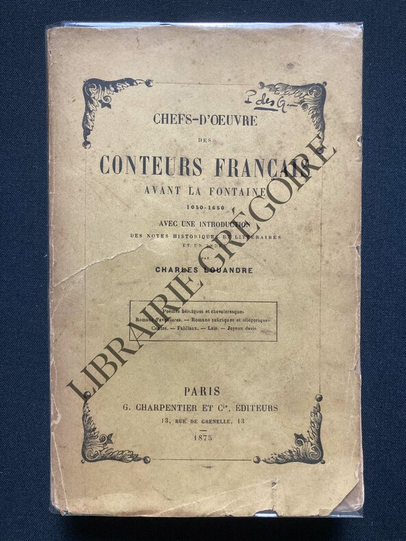 Paris Charpentier et Cie, libraires-éditeurs 1874 in 12 (18x11,5) 1 volume reliure demi basane maroquinée bleu nuit de l'époque, dos à nerfs, XXVIII et 433 pages. Avec une introduction, des notes historiques et littéraires et un index par Charles Louandre. Chefs d'oeuvre des conteurs français, tome 1 seul: Avant la Fontaine, 1050-1650. Bel exemplaire, bien relié ( Photographies sur demande / We can send pictures of this book on simple request )