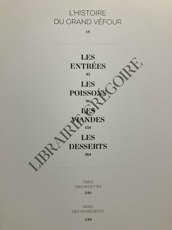 256 PAGES-36,2 CM X 27,7 CM-INTRODUCTION PAR SERGE GLEIZES-L'HISTOIRE DU GRAND VEFOUR-LES ENTREES-LES POISSONS-LES VIANDES-LES DESSERTS-TRANCHES DOREES-3 SIGNETS-SOUS EMBOITAGE-LEGER PLI EN COIFFE DE PIED SINON NEUF-(E225)