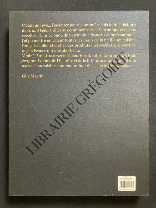 Paris, éd. du Chêne, octobre 2013, EDITION ORIGINALE sur papier glacé, in-folio, cartonnage couv. photos coul. éd., sous emboîtage auteur et titre dorés sur fond bleu foncé pailleté avec filets et guirlande dorées, bien présent du bandeau de lancement de l'éditeur, toutes tranches dorées, très nb. photos en coul. et en noir, de nombreuses reproductions de documents anciens en coul. et en noir, sommaire, table des recettes, index des recettes, biographie et bibliographie de l'auteur, Guy Martin retrace dans ce livre l’histoire du restaurant le plus célèbre de Paris « le Grand Véfour », de sa création en 1784 à aujourd’hui, en rappelant tous les moments forts de cette institution et toutes les célébrités qui y sont passées. Le chef y dévoile une cinquantaine de ses grandes recettes servies au Grand Véfour. La magie du lieu, du service et de la cuisine sont réunies dans ce superbe livre. Guy Martin prend son véritable essor au Château de Divonne où il obtient une première puis une deuxième étoile au guide Michelin. Depuis 1991, il est le chef du Grand Véfour, le célèbre restaurant du Palais Royal à Paris. En 1999, il est élu « meilleur chef de l’année » par le guide Gault&Millau et obtient en 2000 une troisième étoile au Michelin. Une REFERENCE ! Très bon état, comme neuf