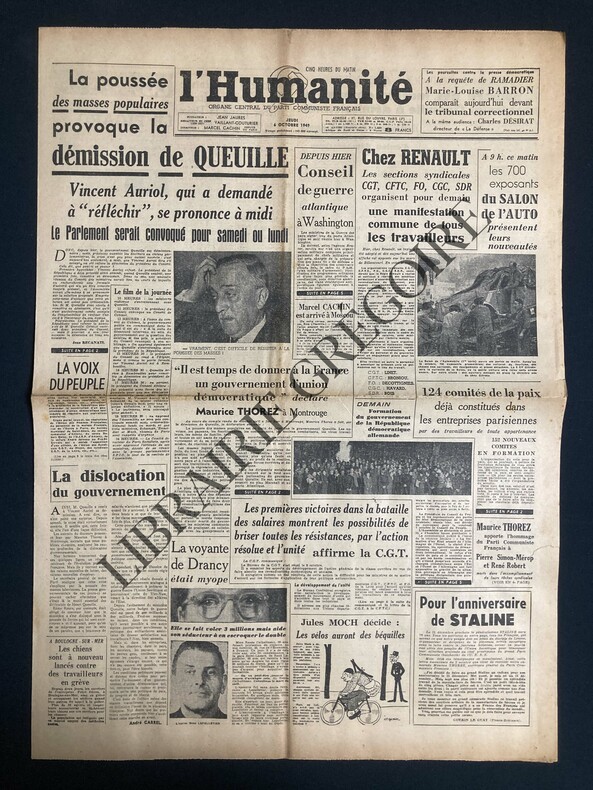 6 PAGES-43 CM X 60 CM-EN UNE: LA POUSSEE DES MASSES POPULAIRES PROVOQUE LA DEMISSION DE QUEUILLE, PHOTO, SUITE P2-JULES MOCH DECIDE: LES VELOS AURONT DES BEQUILLES, DESSIN DE GASSIER-P3: DES PEINTRES DU SALON D'AUTOMNE PARLENT DE LEUR PEINTURE, TIERS DE PAGE, 2 PHOTOS ("LE FOUR ELECTRIQUE" PAR BORIS TASLITZKY-"PAYSANNES DANS L'ALLIER" PAR MICHEL DE GALLARD), ANDRE FOUGERON-AU NOM DE LA LIBERTE LES PROTESTATIONS AFFLUENT CONTRE LE RETRAIT DES DROITS CIVIQUES D'ARAGON-PHOTO ANATOLE FRANCE (8 CM X 7 CM), LEGENDE 14 LIGNES, 25 ANS DE SA MORT-P5: L'ALBANIE N'EST PAS UN MYSTERE NOTES DE VOYAGE DE PIERRE COURTADE III POUR EN FINIR AVEC LA MISERE-THEATRE ANTOINE, "LE PETIT CAFE", PHOTO MARIE DUBAS