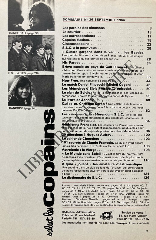 CRITIQUE POUR DOCTEUR FOLAMOUR, FILM DE STANLEY KUBRICK, PHOTO-4 GARCONS DANS LE VENT, 6 PAGES-UNE ESCALE AU PAYS DE FRANCE GALL, 8P-HOP FROG, UNE NOUVELLE D'EDGAR ALLAN POE-LE MATCH DANIEL FILIPACCHI MICHEL COGONI, 4P-VOICI LE DEUXIEME EPISODE D'ELVIS RACONTE PAR LUI-MEME, 4 PAGES-LE CLAN DE SYLVIE CEUX ET CELLES QUI COMPOSENT SON UNIVERS FAMILIER ET PROFESSIONNEL-LA LETTRE DE JOHNNY-QUI ES-TU CHRISTINE CARON UNE DINGUE DU CHRONO-14 PORTRAITS GEANTS DE-TA-CHA-BLES DES VAINQUEURS DU REFERENDUM (CLAUDE FRANCOIS-RICHARD ANTHONY-PETULA CLARK-FRANK ALAMO-FRANCE GALL-FRANCOISE HARDY-SURFS-MARIE LAFORET-JOHNNY HALLYDAY-EDDY MITCHELL-SYLVIE VARTAN-HUGUES AUFRAY-SHEILA-LES LIONCEAUX)-POURQUOI VENISE VA BIEN A FRANCOISE-30 QUESTIONS A HUGUES AUFRAY-ECHEC A CHOUCHOU SHERIF-101 SECRETS DE CLAUDE FRANCOIS-LA VIERGE-LE MONDE SANS SOLEIL, JY COUSTEAU