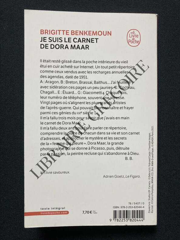 Il était resté glissé dans la poche intérieure du vieil étui en cuir acheté sur Internet. Un tout petit répertoire, comme ceux vendus avec les recharges annuelles des agendas, daté de 1951.<br data-mce-fragment="1">A : Aragon. B : Breton, Brassaï, Braque, Balthus… J’ai feuilleté avec sidération ces pages un peu jaunies. C : Cocteau, Chagall… E : Éluard… G : Giacometti… À chaque fois, leur numéro de téléphone, souvent une adresse. L : Lacan…<br data-mce-fragment="1">P : Ponge, Poulenc… Vingt pages où s’alignent les plus grands artistes de l’après-guerre. Qui pouvait bien connaître et frayer parmi ces génies du xxe siècle ?<br data-mce-fragment="1">Il m’a fallu trois mois pour savoir que j’avais en main le carnet de Dora Maar.<br data-mce-fragment="1">Il m’a fallu deux ans pour faire parler ce répertoire, comprendre la place de chacun dans sa vie et son carnet d’adresses, et approcher le mystère et les secrets de la « femme qui pleure ». Dora Maar, la grande photographe qui se donne à Picasso, puis, détruite par la passion, la peintre recluse qui s’abandonne à Dieu. Et dans son sillage, renaît un Paris où les amis s’appellent Balthus, Éluard, Leiris ou Noailles. Paris, 2019 Stock 340 p., broché. 14 x 22
