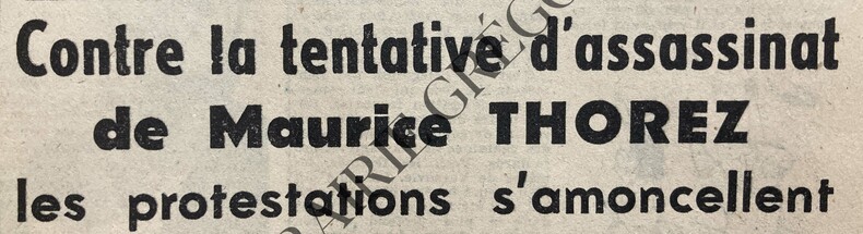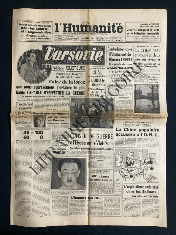 8 PAGES-43 CM X 60 CM-EN UNE: VARSOVIE FREDERIC JOLIOT CURIE DEVANT LE 2e CONGRES MONDIAL DE LA PAIX, PHOTO-CONSEIL DE GUERRE A L'ELYSEE SUR LE VIET NAM CONSEIL DES MINISTRES EXTRAORDINAIRE CE MATIN, SUITE P5-CONTRE LA TENTATIVE D'ASSASSINAT DE MAURICE THOREZ LES PROTESTATIONS S'AMONCELLENT A L'AMBASSADE AMERICAINE-L'IMPERIALISME AMERICAIN DANS LES BALKANS, PAR MARCEL CACHIN-LAS DE SA TRISTE VIE LE TROISIEME "FRATELLINI" S'EST JETE SOUS LE METRO, PHOTO, L'HOMME QUI RIT., PAR SIMONE TERY, SUITE P8,GABRIEL GERETTI S'EST JETE SOUS UNE RAME DE METRO A LA STATION BOTZARIS-P2 P3: LE RAPPORT DE JOLIOT CURIE AU 2e CONGRES MONDIAL DE LA PAIX-P4: A CHACUN SA ROUTE, MAURICE SCHUMAN, PHOTO-LA MAJORITE CONTINUE A AMNISTIER LES COLLABOS, HUTIN DESGRES