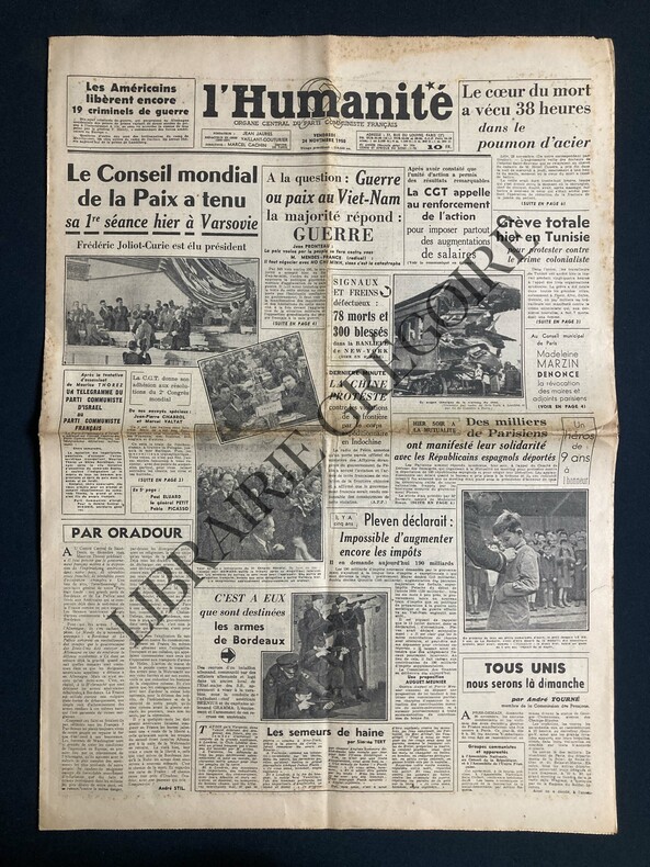 6 PAGES-43 CM X 60 CM-EN UNE: LE CONSEIL MONDIAL DE LA PAIX A TENU SA 1re SEANCE HIER A VARSOVIE FREDERIC JOLIOT CURIE EST ELU PRESIDENT, 3 PHOTOS-SIGNAUX ET FREINS DEFECTUEUX: 78 MORTS ET 300 BLESSES DANS LA BANLIEUE DE NEW YORK, PHOTO-P5: PICASSO BON OUVRIER DE LA PAIX, PAR PAUL ELUARD, PHOTO AFFICHE MAISON DE LA PENSEE FRANCAISE-LE CHANT GENERAL DE PABLO NERUDA, PAR JEAN KANAPA-DEPUIS QUE JE SUIS LA-DEDANS!., PAR NAZIM HIKMET-SEPT PARMI CEUX DONT LE MONDE ENTIER REPETE LES NOMS, 7 DESSINS (PICASSO-DAQUIN-HIKMET-NERUDA-.)