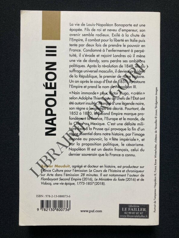 1 planche en frontispice, portrait photographique de Napoléon III dans son cabinet des Tuileries (complet) 5eme édition, 1893 Contents, Chapitres : Au lecteur, ii, texte, 367 pages - L'homme intime - L'homme politique - Le prince Napoléon - Ombres tragiques - L'empereur et les salons - Eugène Rouher - Emile Ollivier - Apothéose - Le drame (mort tragique de Maximilien, empereur du Mexique) - La déclaration de guerre - Sedan - La fin d'un règne - Pierre de Lano, 1859-1904 est un écrivain français - Charles-Louis-Napoléon Bonaparte, dit Louis-Napoléon Bonaparte, né le 20 avril 1808 à Paris et mort le 9 janvier 1873 à Chislehurst (Royaume-Uni), est un monarque et un homme d'État français. Il est à la fois l'unique président de la Deuxième République, le premier chef d'État français élu au suffrage universel masculin, le 10 décembre 1848, le premier président de la République française, et après la proclamation de l'Empire le 2 décembre 1852, le dernier monarque du pays sous le nom de Napoléon III, empereur des Français. - Troisième fils de Louis Napoléon Bonaparte dit Louis Bonaparte, roi de Hollande, et d'Hortense de Beauharnais, il naît prince français et prince de Hollande : neveu de l'Empereur Napoléon Ier, il est à la fois neveu et petit-fils de l'impératrice Joséphine de Beauharnais (sa grand-mère maternelle). Exilé après la chute de l'Empire, conspirateur avec son frère aîné pour l'unité italienne, il devient héritier présomptif du trône impérial après les morts successives de son frère aîné Napoléon-Louis en 1831, et de son cousin le duc de Reichstadt (Napoléon II, roi de Rome) en 1832. Ses premières tentatives de coup d'État, mal préparées (Strasbourg en 1836, Boulogne-sur-Mer en 1840), échouent. Il est condamné à l'emprisonnement au fort de Ham. Mais il profite des suites de la révolution française de 1848 pour se faire élire représentant du peuple puis président de la République. Son coup d'État du 2 décembre 1851 met fin à la Deuxième République, et lui permet l'année suivante de restaurer l'Empire à son profit. Face à l'opposition des républicains, des libéraux de Adolphe Thiers, de certains monarchistes et des catholiques (après l'unité italienne), il donne à son pouvoir un « Empire autoritaire » qui s'atténue après 1859 pour laisser place, progressivement, à un « Empire libéral ». La philosophie politique qu'il met en place, et qu'il présente dans ses Idées napoléoniennes et dans De l'extinction du paupérisme (1844), est une synthèse d'un bonapartisme mêlé à du romantisme, du libéralisme autoritaire, et du socialisme utopique. Le règne de cet admirateur de la modernité britannique est marqué par un développement industriel, économique et financier sensible, porté par une forte croissance mondiale qu'illustre la transformation de Paris sous l'autorité du préfet Georges Eugène Haussmann. Sa politique extérieure vise à restaurer la puissance française en Europe et dans le monde. Il rompt l'isolement diplomatique voulu au congrès de Vienne par trois puissances de la Sainte-Alliance, son entente avec la Grande-Bretagne lors de la guerre de Crimée contre la Russie, son soutien aux mouvements nationaux en particulier lors de l'unité italienne contre l'Empire d'Autriche, et ses diverses opérations outre-mer parfois en coalition avec la Grande-Bretagne permettent l'agrandissement du territoire (Nice, Savoie) ainsi qu'une expansion coloniale et commerciale. Elle provoque cependant l'hostilité du royaume de Prusse et subit un échec au Mexique. Les tensions avec la Prusse aboutissent au piège de la dépêche d'Ems et à la guerre franco-allemande de 1870, qui scelle la fin du Second Empire. Le 2 septembre 1870, Napoléon III est capturé lors de la bataille de Sedan. Le 4 septembre 1870, la Troisième République est proclamée. Napoléon III part en exil en Angleterre, où il meurt en janvier 1873. (source : Wikipedia) couverture propre, à peine brunie sur les bords et les dos avec quelques rousseurs, une infime déchirure sans manque sur le haut du mors du plat supérieur, intérieur sinon propre, papier à peine jauni avec quelques rousseurs, cela reste un bon exemplaire de la 5eme édition de 1893