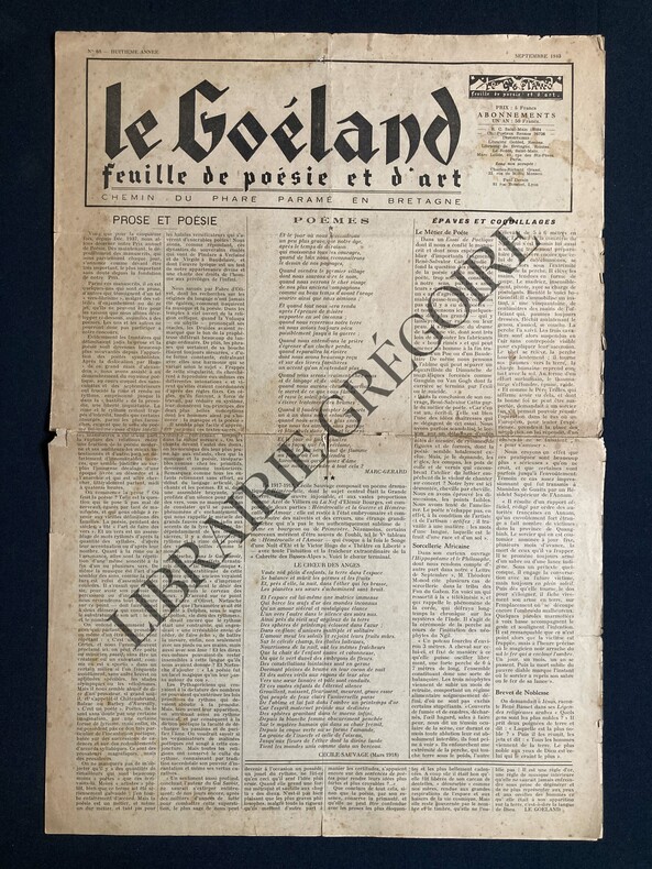 FEUILLE DE POESIE ET D'ART-CHEMIN DU PHARE PARAME EN BRETAGNE4 PAGES-38,5 CM X 55,5 CM-POEME DE MARC GERARD-POEME DE CECILE SAUVAGE (LE CHOEUR DES ANGES)-JUDITH GAUTIER ET VILLIERS DE L'ISLE ADAM AUPRES DE RICHARD WAGNER, DEMI PAGE, PHOTO-CRITIQUE PAR RENE MARTINEAU POUR LES IMPUDENTS DE MARGUERITE DURAS, DEMI PAGE-PRIX DE POESIE DU GOELAND-LE PLUS GRAND AMOUR DE LOUIS VIERNE, PAR ALAIN MESSIAEN, PHOTO-UN OUVRAGE D'ARMAND GODOY SUR MILOSZ-J.-E. LABOUREUR, PAR MARCEL LEBARBIER-QUELQUES SALISSURES EN UNE-(PJ1)