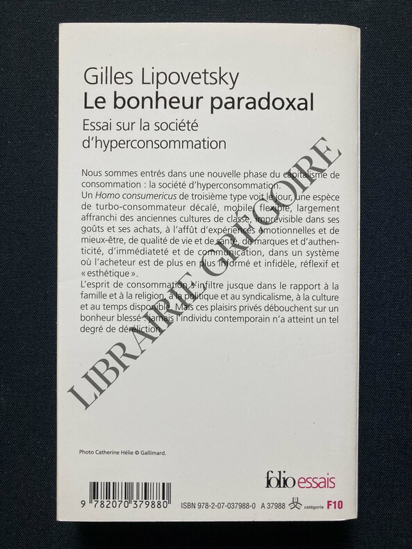 Sous-tendu par la nouvelle religion de l'amélioration continuelle des conditions de vie, le mieux-vivre est devenu une passion de masse, le but suprême des sociétés démocratiques, un idéal exalté à tous les coins de rue. Nous sommes entrés dans une nouvelle phase du capitalisme : la société d'hyperconsommation. Un Homo consumericus de troisième type voit le jour, une espèce de turbo-consommateur décalé, mobile, flexible, largement affranchi des anciennes cultures de classe, imprévisible dans ses goûts et ses achats, à l'affût d'expériences émotionnelles et de mieux-être, de qualité de vie et de santé, de marques et d'authenticité, d'immédiateté et de communication. La consommation intimisée a pris la relève de la consommation honorifique dans un système où l'acheteur est de plus en plus informé et infidèle, réflexif et «esthétique». L'esprit de consommation a réussi à s'infiltrer jusque dans le rapport à la famille et à la religion, à la politique et au syndicalisme, à la culture et au temps disponible. Tout se passe comme si, dorénavant, la consommation fonctionnait tel un empire sans temps mort dont les contours sont infinis. Mais ces plaisirs privés débouchent sur un bonheur blessé : jamais, montre Gilles Lipovetsky, l'individu contemporain n'a atteint un tel degré de déréliction.'' Très belle condition.
