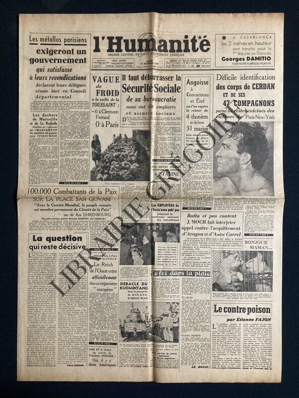 4 PAGES-42 CM X 60 CM-EN UNE: DIFFICILE IDENTIFICATION DES CORPS DE CERDAN ET DE SES 47 COMPAGNONS PARMI LES RESTES CALCINES DES VICTIMES DU PARIS-NEW-YORK, PHOTO 10 CM X 12 CM, SUITE P4-P3: OUI, IL Y A DEUX AMERIQUES, PAR VLADIMIR POZNER-
